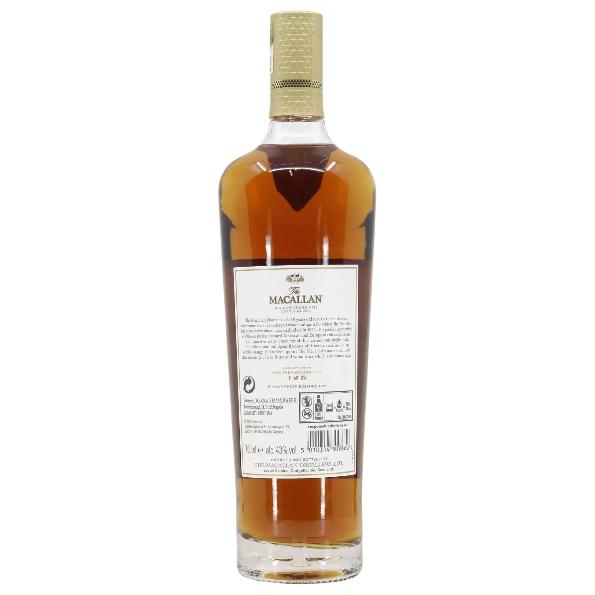 Discover the harmony of flavors with the Macallan Double Cask 18 Year Old – 2022 Edition , a Scottish single malt that combines the richness of European oak with the sweetness of American oak, both seasoned with sherry.This dual maturation brings a unique complexity, offering a refined and balanced sensorial experience.